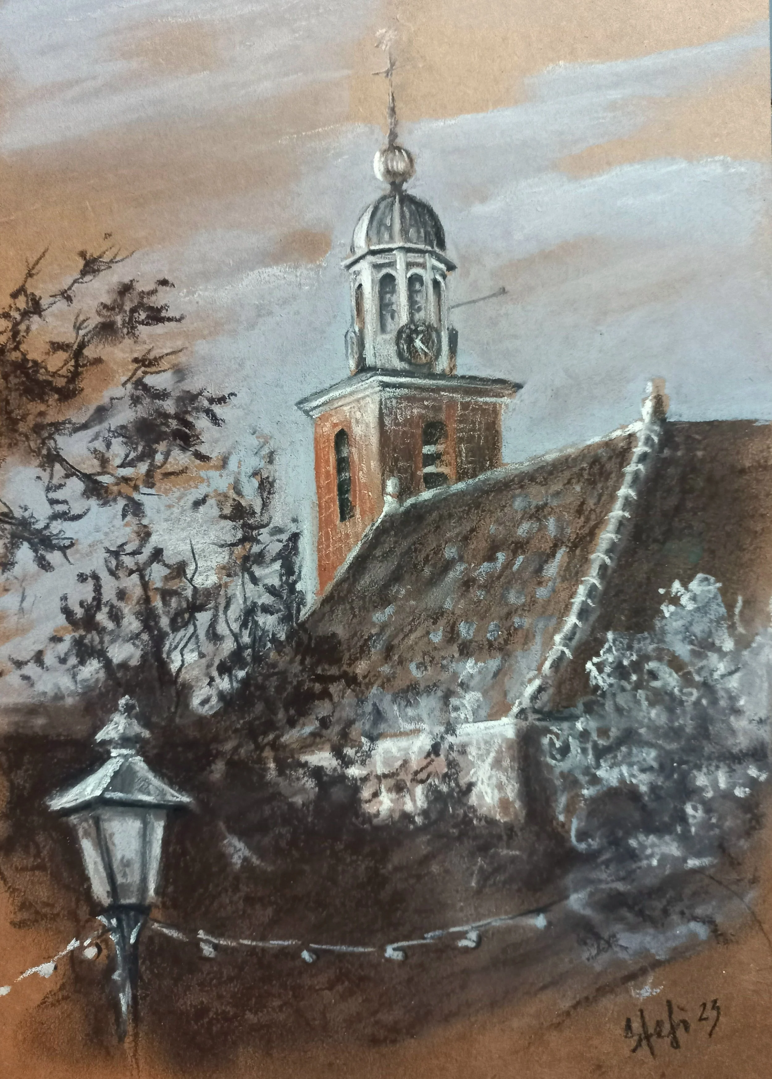 Wanneer met over de Beekmansbrug de vesting van Hellevoetsluis binnen komt, kan men de Vestingkerk al zien staan. In dit stuk de deze kerk vanuit dit perspectief vastgelegd. Anders dan het vooraanzicht wat wij zo gewend zijn, maar des te makkelijker zink je weg in dit werk.